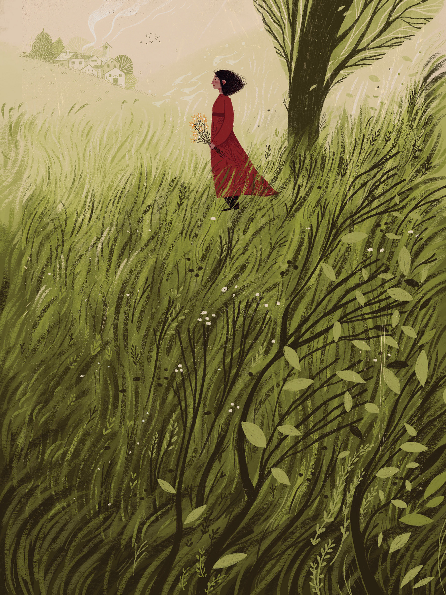 She’s strolling through the countryside, the place they call the village;