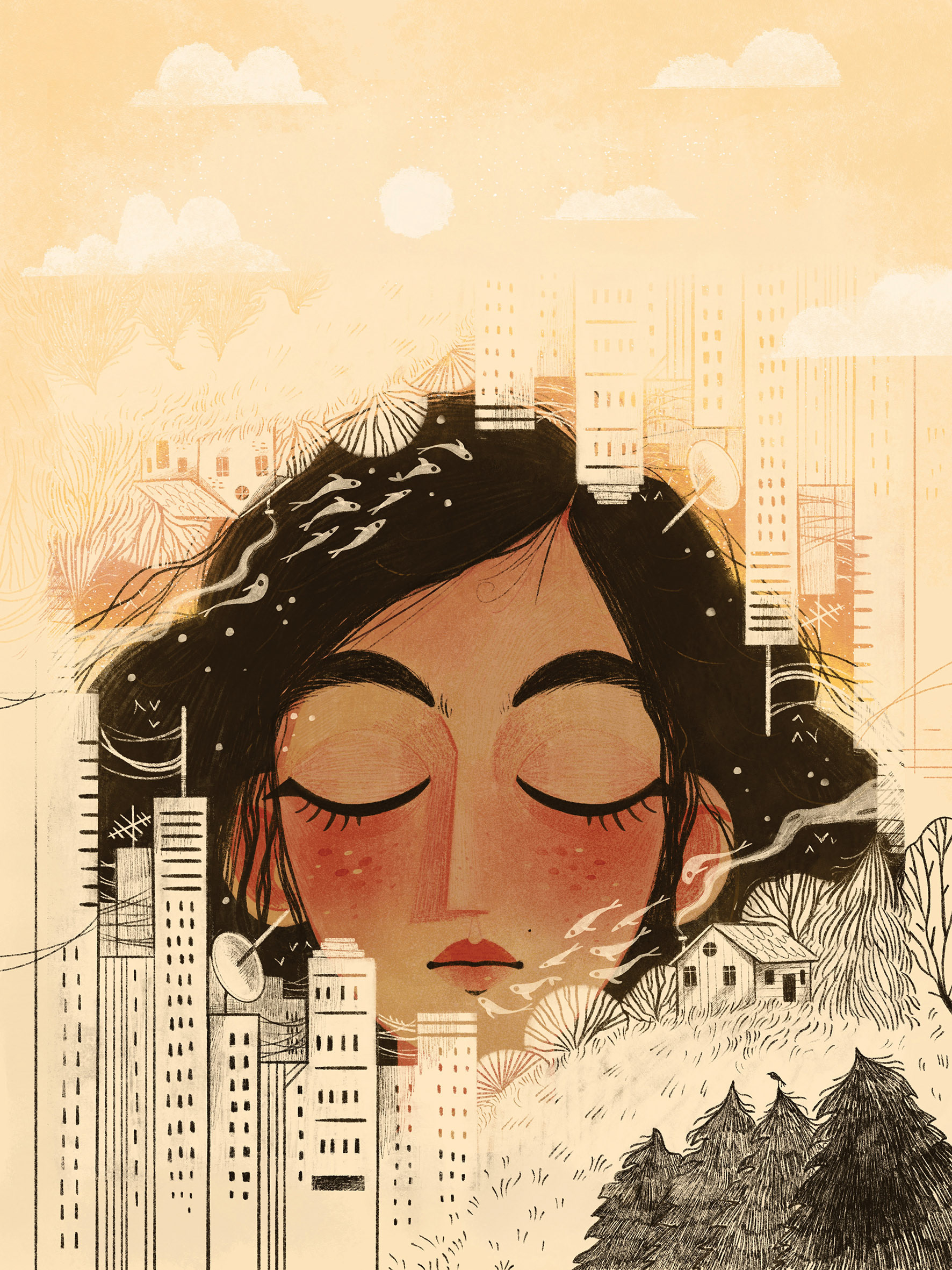 Cette série d’illustrations s’inspire d’un poème intime et ironique, un voyage intérieur entre rêverie champêtre et réalité urbaine.
